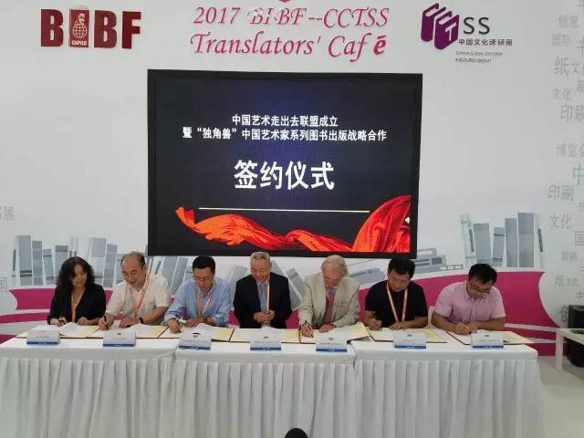 中国图书进出口总公司、英国独角兽出版集团、北京英创国际文化发展有限责任公司、山东美术出版社、江西美术出版社、福建美术出版社、北京颂雅风文化传媒公司等出版机构,以及艺术家代表出席了签约仪式。